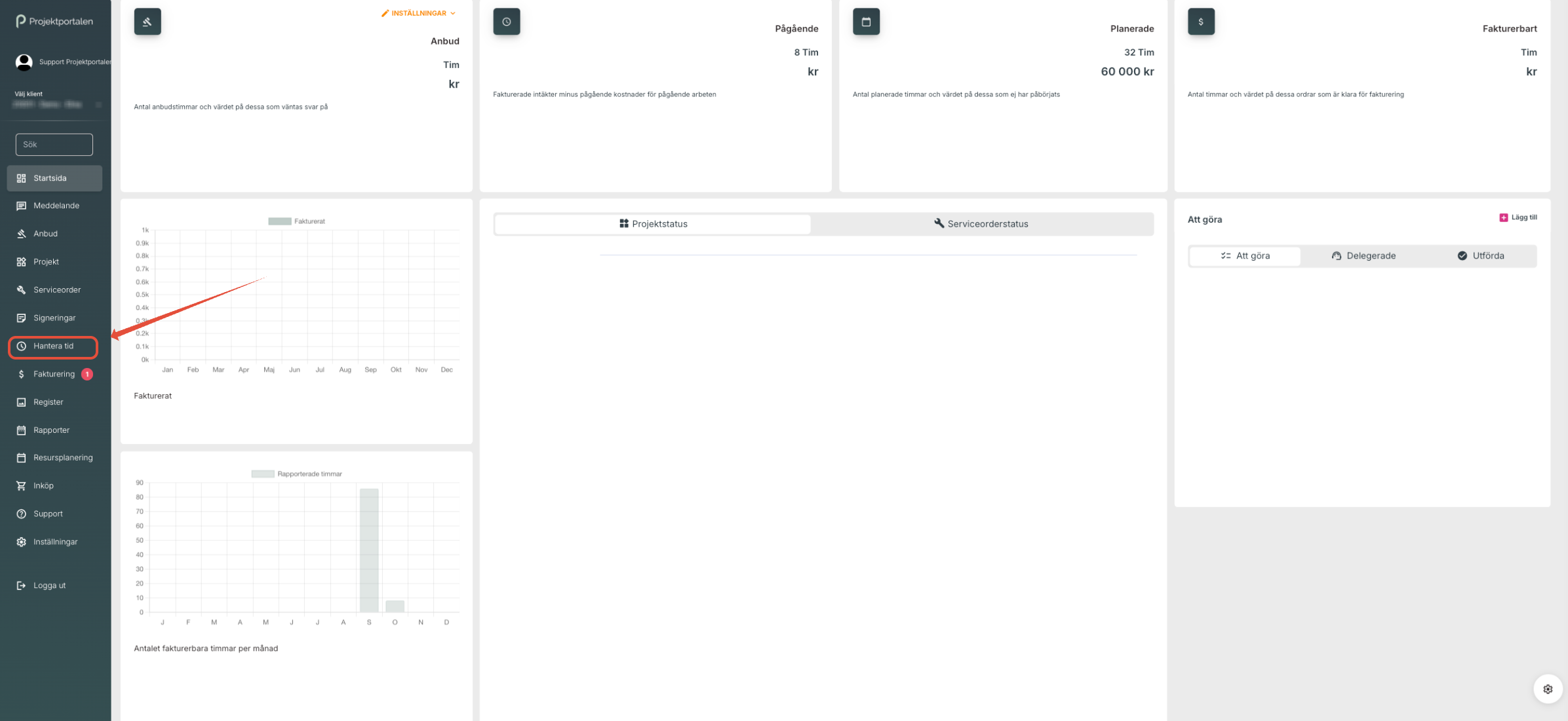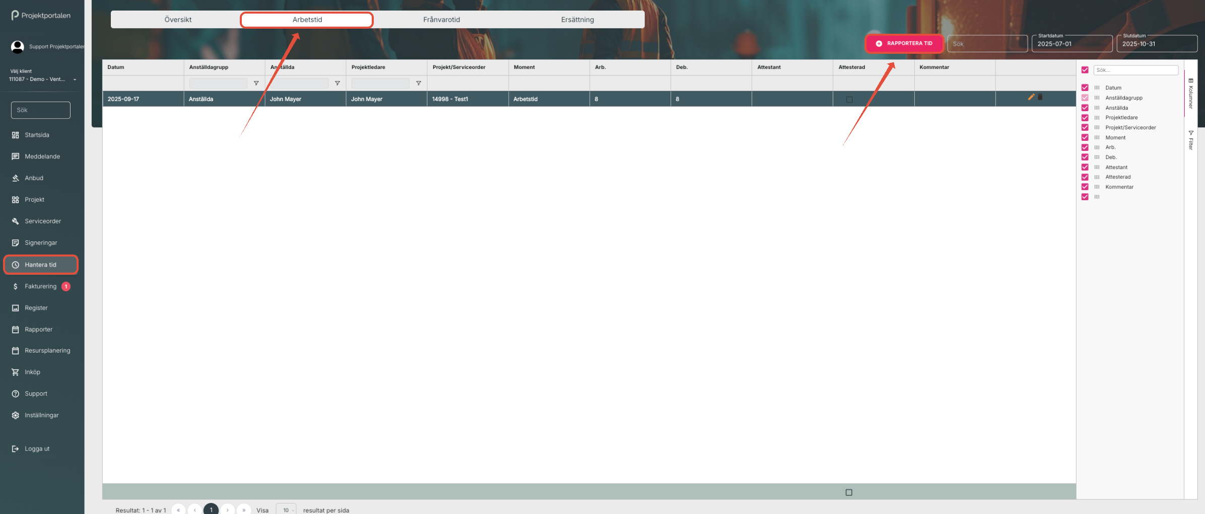 a. För att rapportera arbetstid klicka på Arbetstid och Rapportera tid: