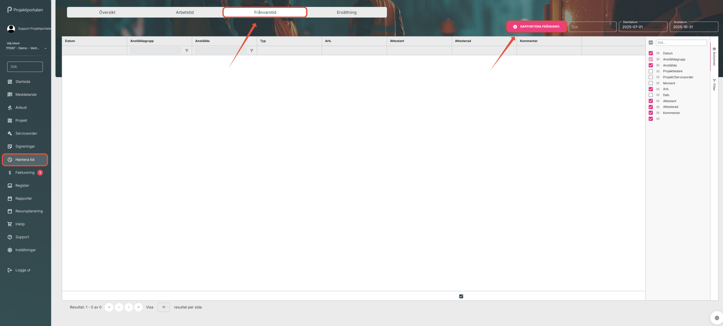 b. För att rapportera frånvarotid klicka på Frånvarotid och Rapportera frånvaro: