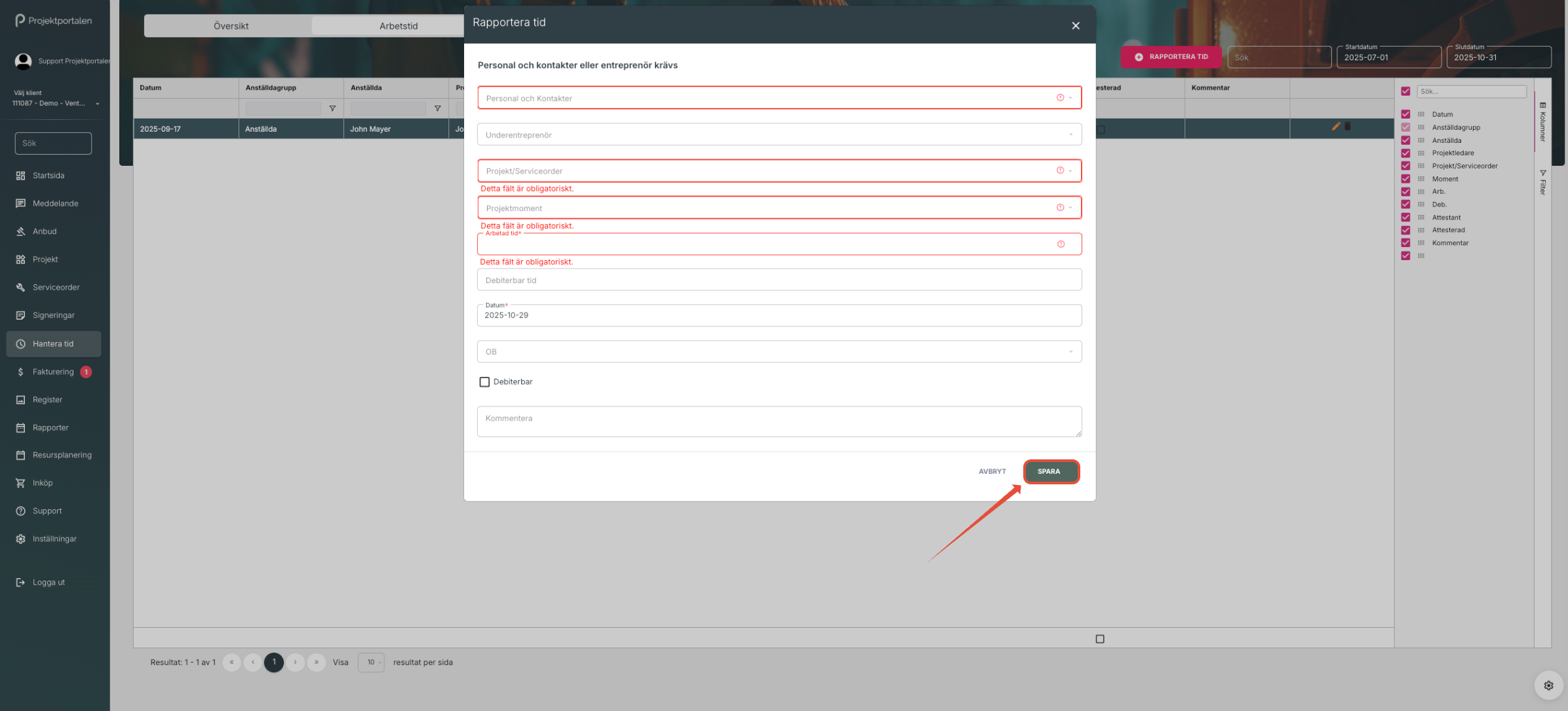 Fyll i information, röd markering innebär att fältet är obligatoriskt, och klicka på Spara.
