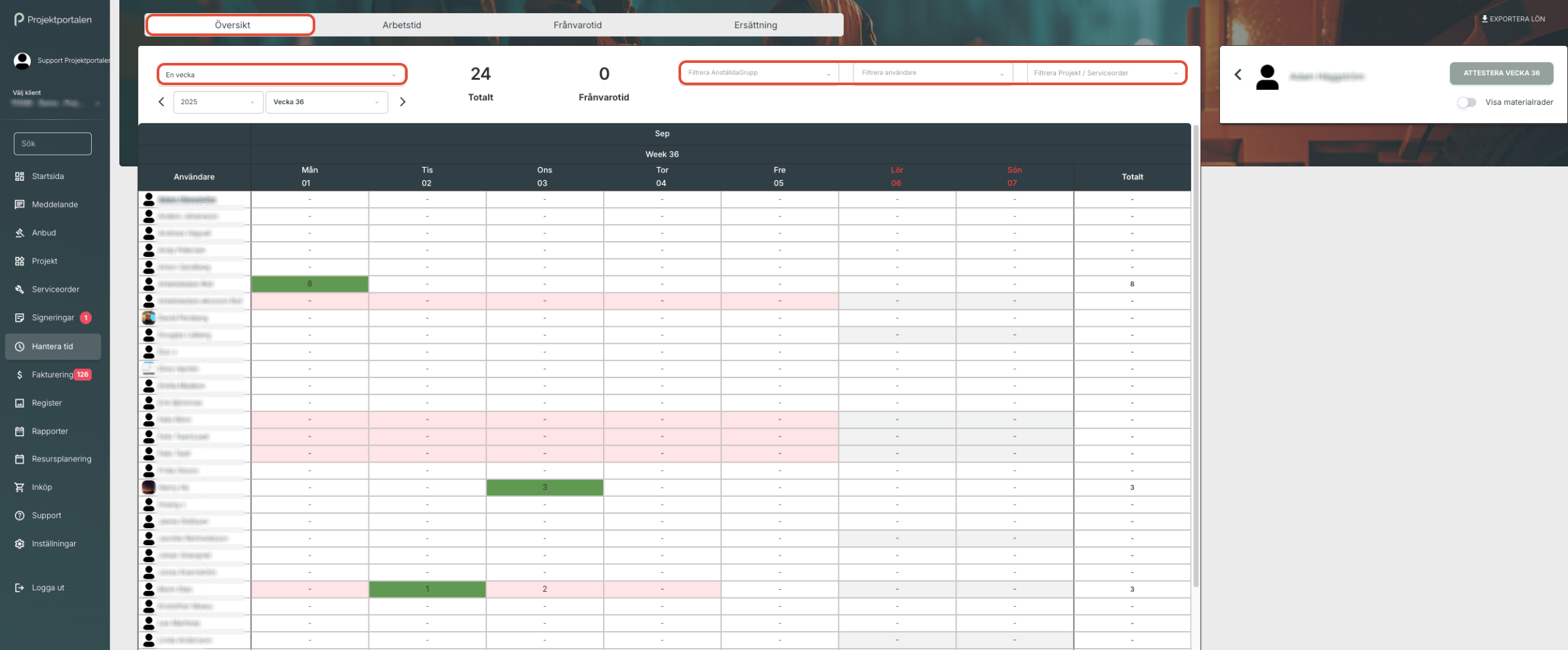 3. Under översikt kan du se alla anställdas tidsrapporteringar, och även filtrera på tidsintervall, anställd och projekt.