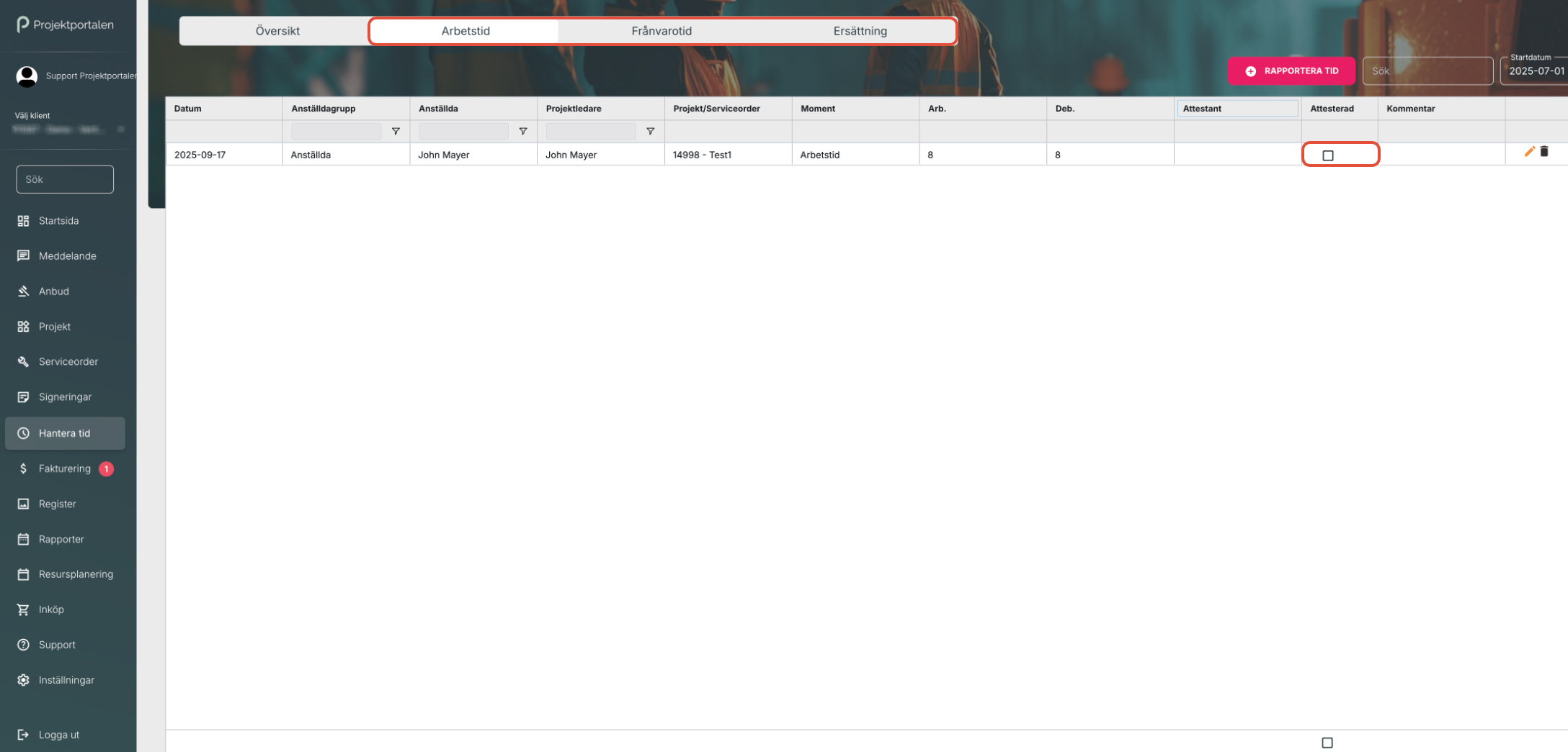 b. Under flikarna Arbetstid, Frånvarotid och Ersättning kan du enkelt attestera en specifik inrapportering genom att bocka i rutan under kolumnen Attesterad. När du bockat i rutan sparas det automatiskt. För att se vem som attesterat en specifik inrapportering se kolumnen Attestant.