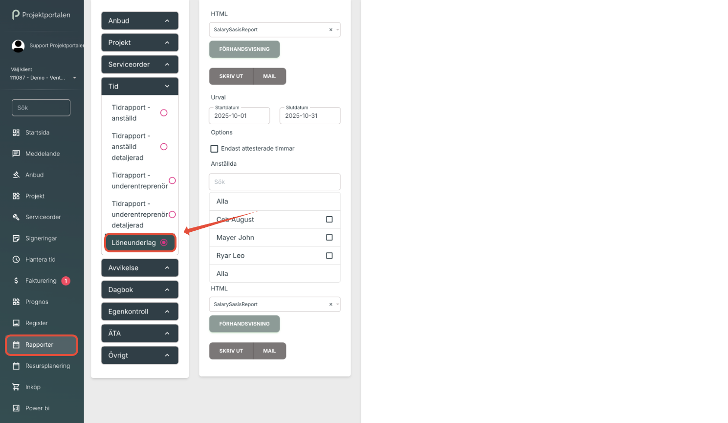 3. Välj en eller flera anställda och klicka på förhandsvisning. Om du är nöjd har du nu två alternativ, ladda ner filen för utskrift och/eller att maila den vidare.