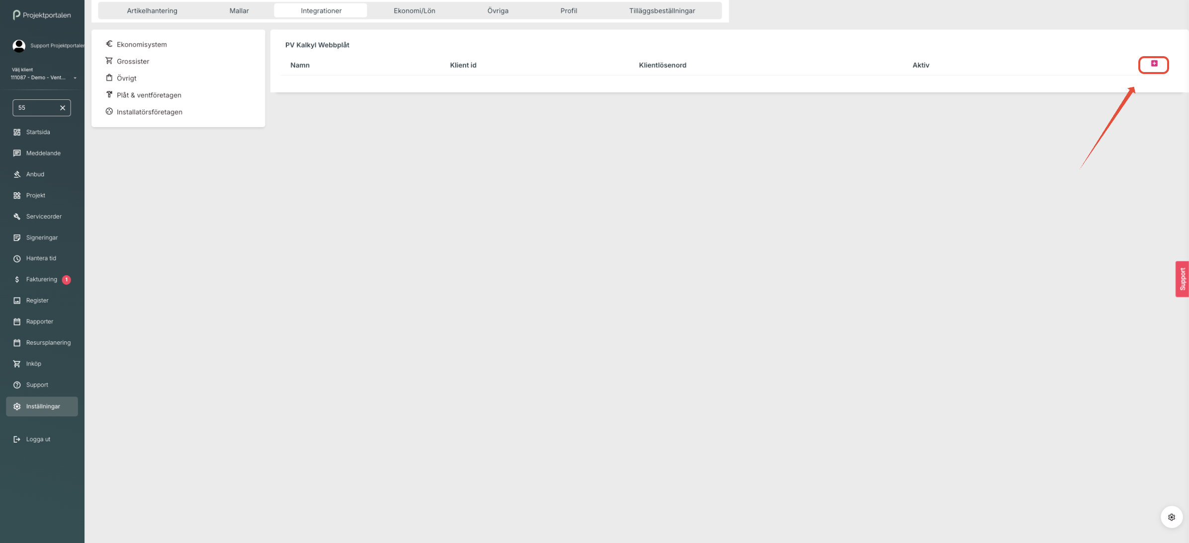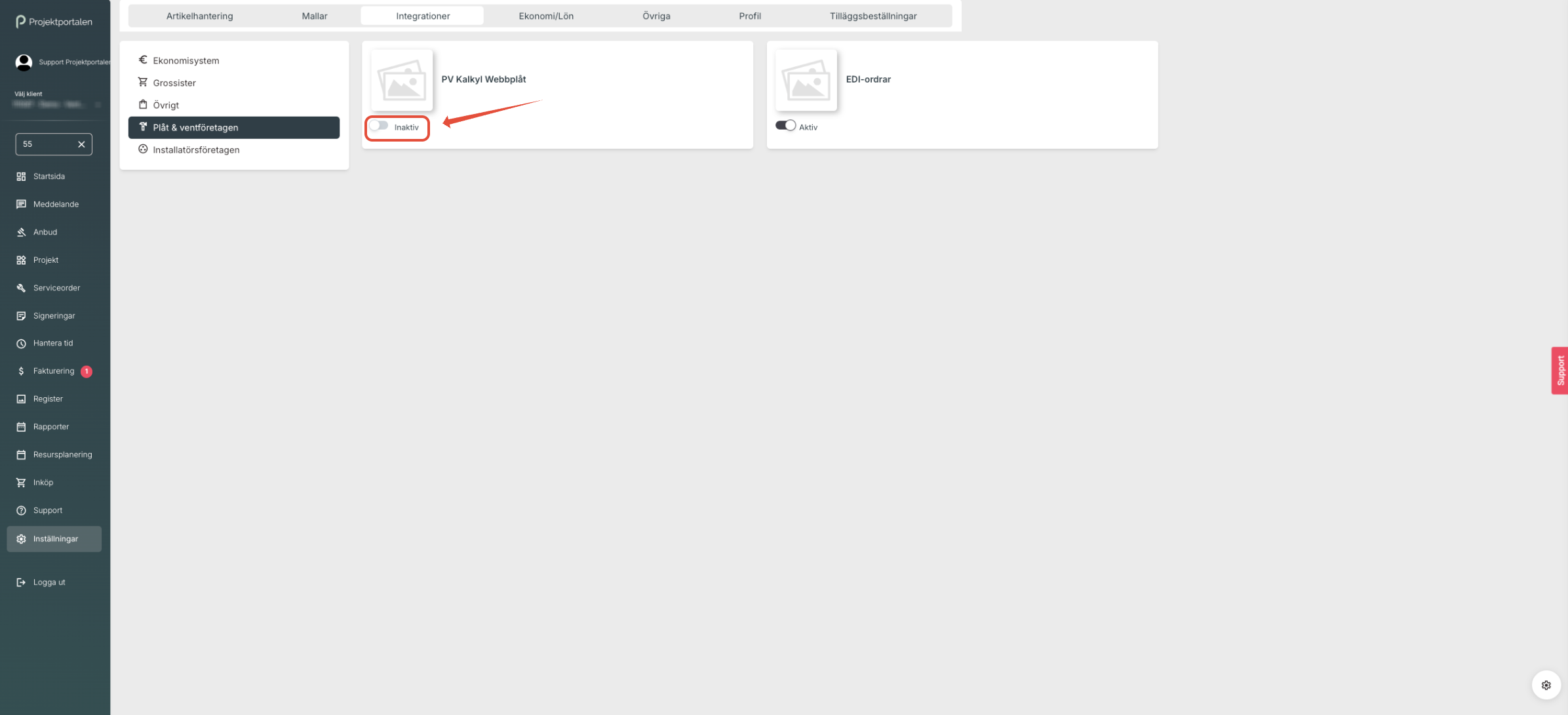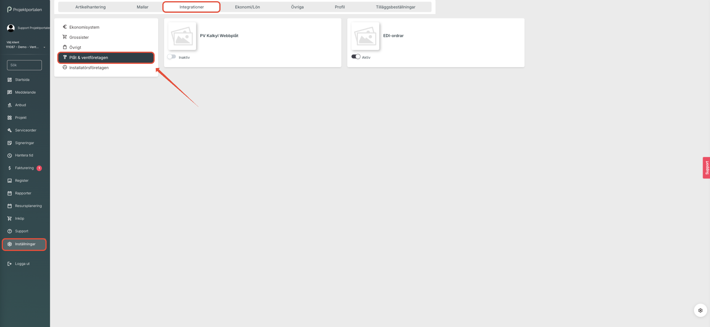2. Klicka på Integrationer och Plåt & ventföretagen