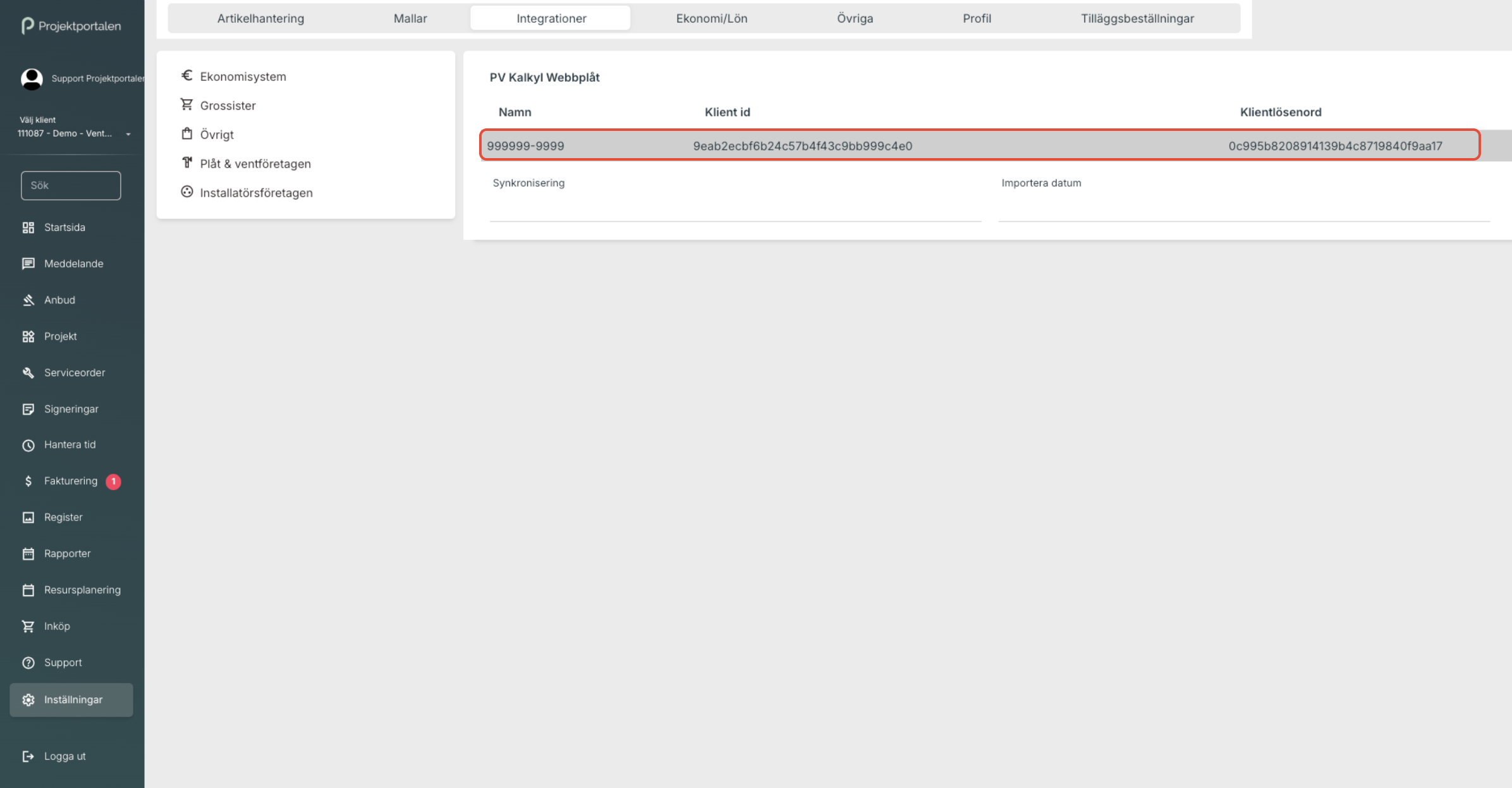 PV Kalkyl Byggplåt Inga kunder synkroniseras från Byggplåt till Projektportalen. PV Kalkyl Webbplåt För att undvika dubbletter vid synkronisering av kunder mellan systemen måste följande uppgifter vara ifyllda: - Organisationsnummer för alla företagskunder - Personnummer för alla företagskunder Dessa uppgifter ska finnas angivna både i PV Kalkyl Webbplåt och i Projektportalen.