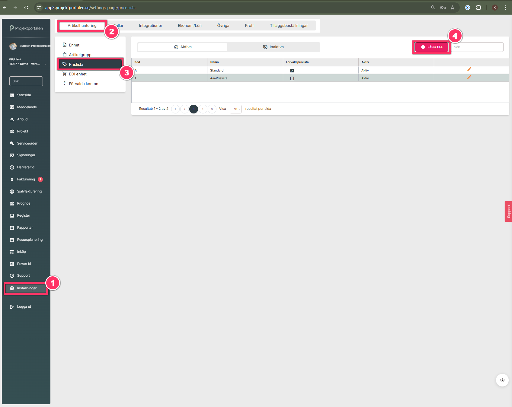 1. Tryck på Inställningar i vänstermenyn, sedan Artikelhantering. Därefter väljer du Prislista och sedan trycker du på Lägg till